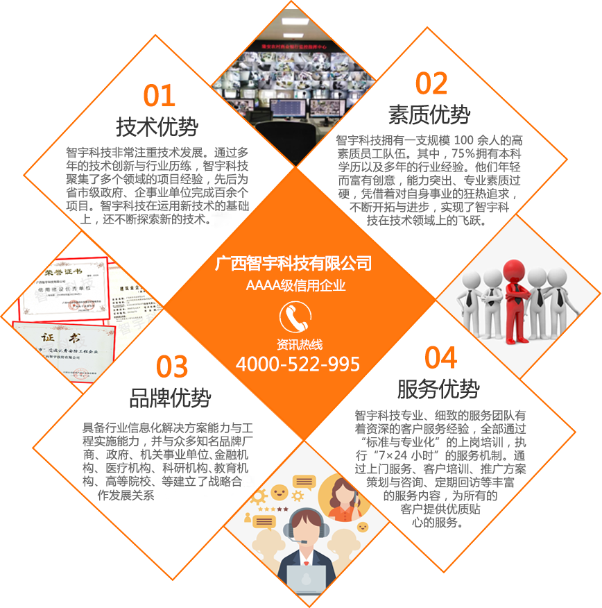廣西智宇科技有限公司,自1995年成立以來(lái),已發(fā)展成為一家高新技術(shù)企業(yè),擁有多家分公司,遍布南寧、桂林、玉林、河池、扶綏、百色、欽州、防城港等地。憑借30年的專(zhuān)業(yè)經(jīng)驗(yàn)和技術(shù)儲(chǔ)備,智宇科技已成為一家行業(yè)領(lǐng)先的集團(tuán)企業(yè),致力于運(yùn)用前沿科技產(chǎn)品和技術(shù),為客戶提供高效服務(wù)。